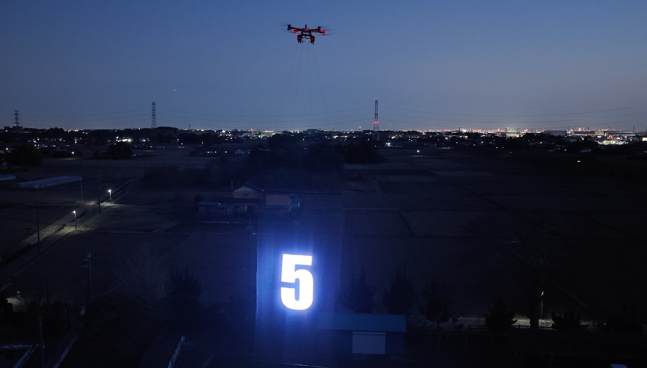 SKY LEDは、5m×10mのLEDスクリーンをドローンで掲げ、空に映像を浮かび上がらせる空中スクリーンです。