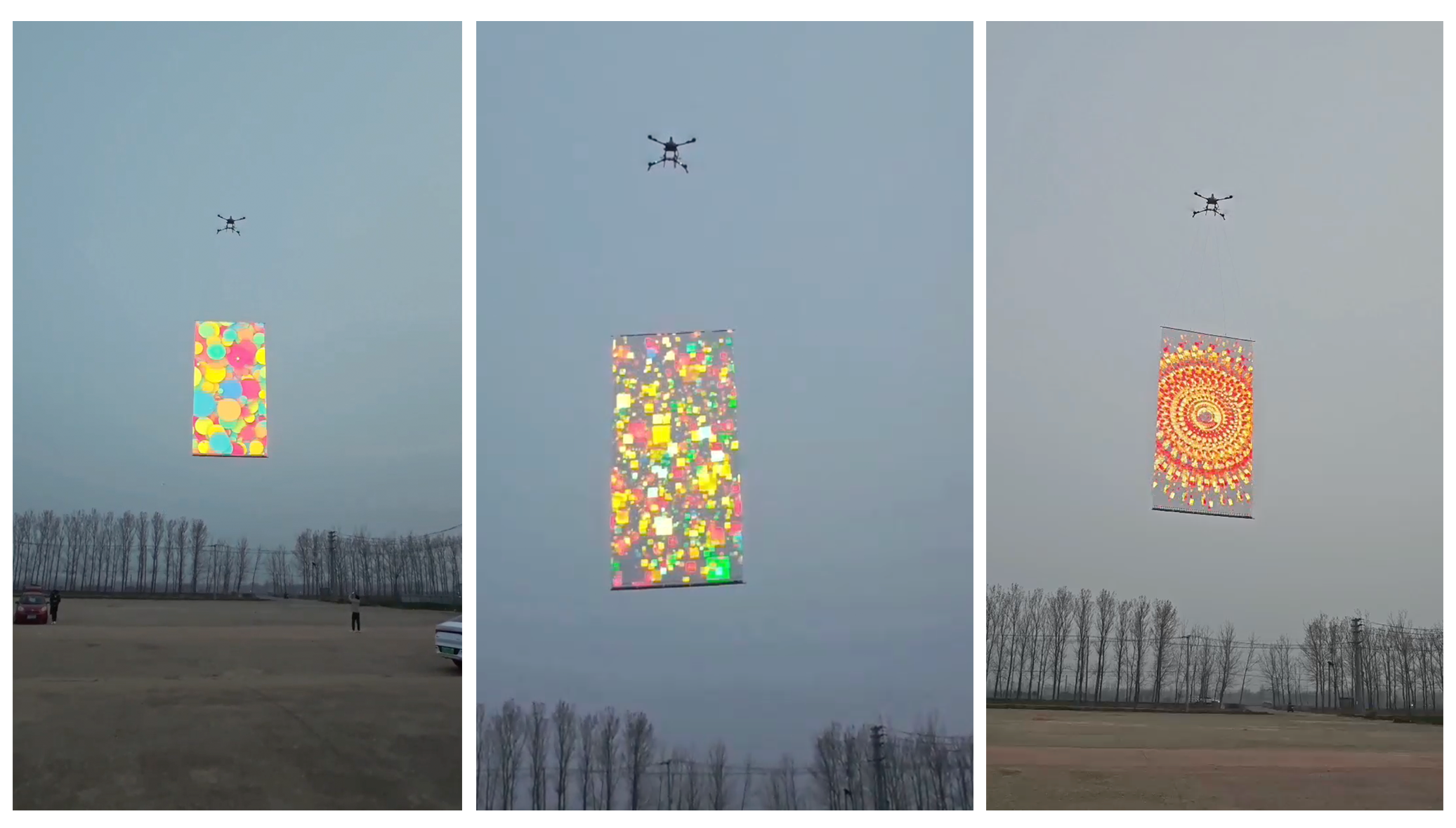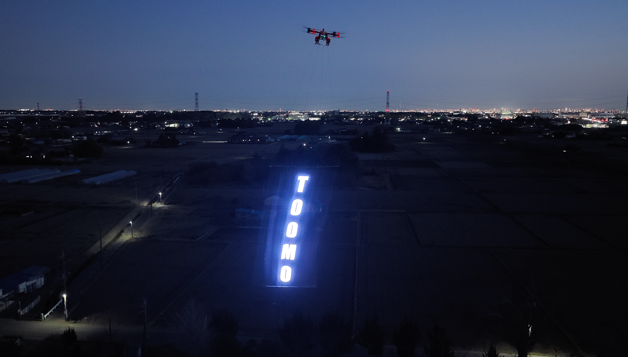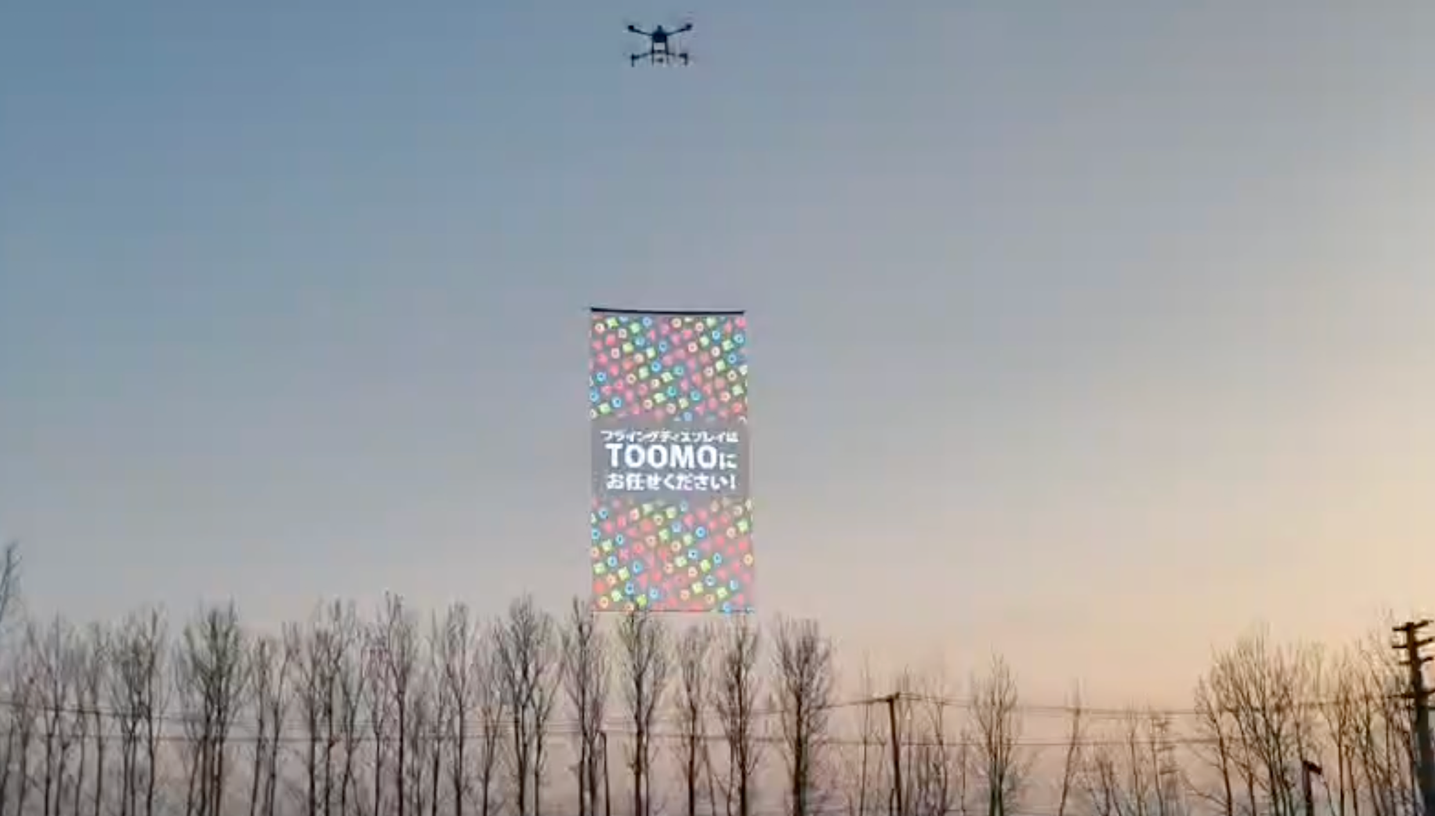 SKY LEDは、5m×10mのLEDスクリーンをドローンで掲げ、空に映像を浮かび上がらせる空中スクリーンです。